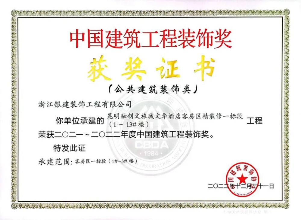 星光不問趕路人,時(shí)光不負(fù)有心人。2022年,浙江銀建裝飾工程有限公司專注于“五星級(jí)酒店 高端豪宅 大平層精裝”,以“厚德載物 精一求精”的姿態(tài),搶占至高點(diǎn),樹典型、立標(biāo)桿,在裝飾路上奮力書寫,取得了2項(xiàng)中國(guó)建筑工程裝飾獎(jiǎng)的好成績(jī)!