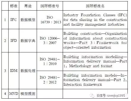 International Ltd.)提出的BIM理念,涉及數(shù)據(jù)模型用的IFC(Industry Foundation Classes)標(biāo)準(zhǔn)、數(shù)據(jù)字典用的IFD(International Framework for Dictionaries)標(biāo)準(zhǔn)(現(xiàn)改稱The buildingSMART Data Dictionary, bsDD)、數(shù)據(jù)處理用的IDM(Information Delivery Manual)標(biāo)準(zhǔn)、模型視圖用的MVD(Model View Definition)標(biāo)準(zhǔn)等。這些標(biāo)準(zhǔn)現(xiàn)已大部分轉(zhuǎn)化為了國際標(biāo)準(zhǔn)。此外,另有一系列普適于多個行業(yè)的產(chǎn)品模型數(shù)據(jù)交換國際標(biāo)準(zhǔn)STEP(ISO 10303 Industrial automation systems and integration—Product data representation and exchange)。