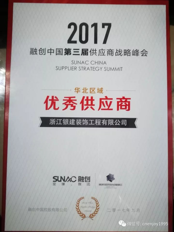 在本次會(huì)議上浙江銀建裝飾工程有限公司(簡(jiǎn)稱銀建裝飾)榮獲融創(chuàng)中國(guó)“優(yōu)秀供應(yīng)商”稱號(hào),也是整個(gè)華北區(qū)域獨(dú)家授權(quán)的唯一一個(gè)供應(yīng)商。