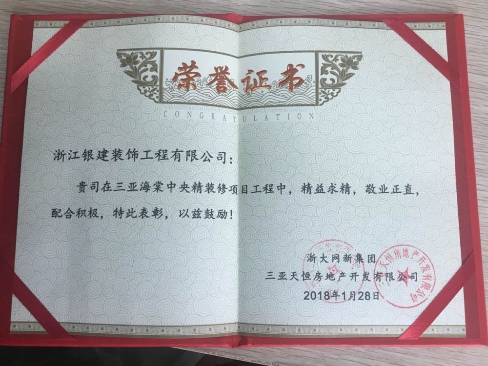 2018年新年伊始,我司海棠中央項(xiàng)目部收到浙大網(wǎng)新集團(tuán)頒發(fā)的新年賀章!“精益求精、敬業(yè)正直”配合積極是業(yè)主單位對(duì)項(xiàng)目部的高度評(píng)價(jià)。