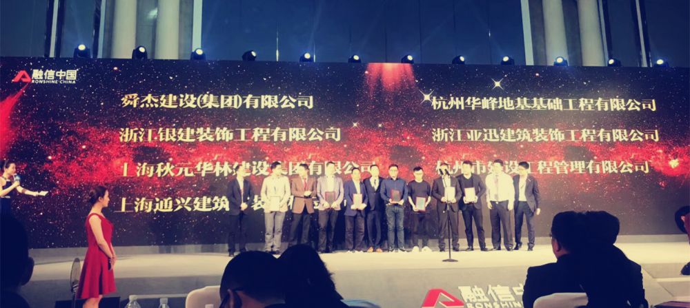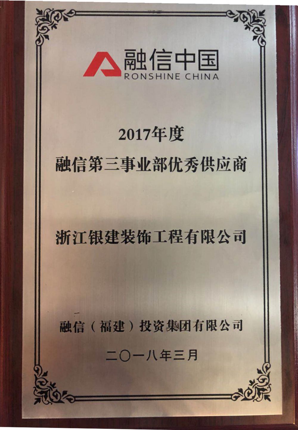 二〇一八年四月十三日下午,在以“融通四海、信贏未來”為主題的“融信2018年度供應(yīng)商大會上”,十三分公司代表上臺領(lǐng)取了融信中國授予“浙江銀建裝飾工程有限公司”的“優(yōu)秀供應(yīng)商”獎牌。