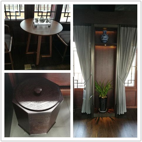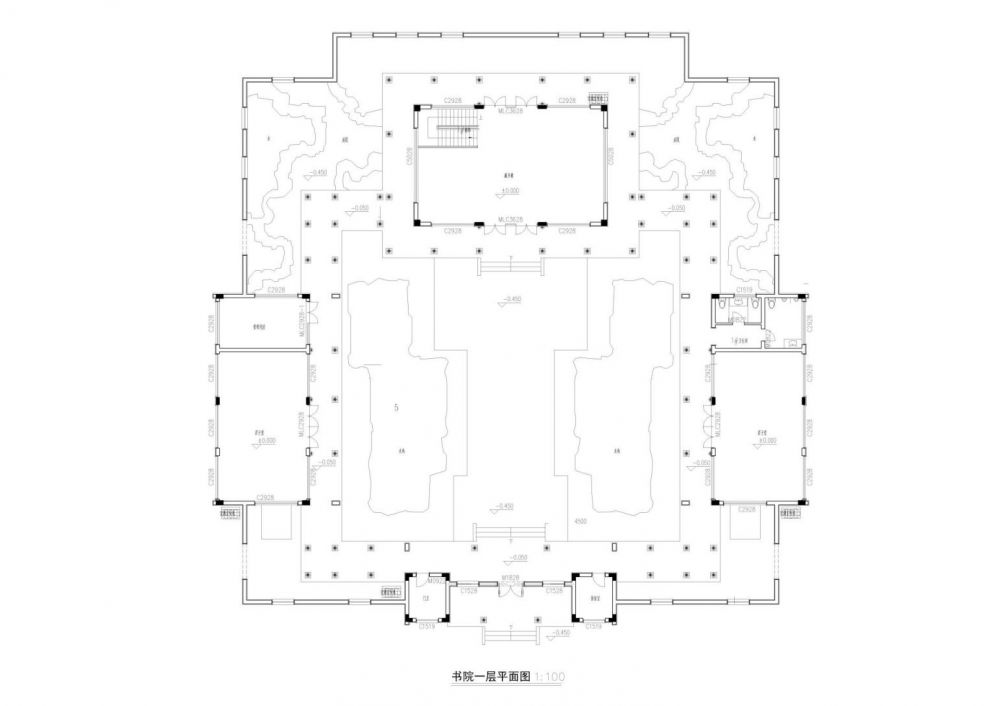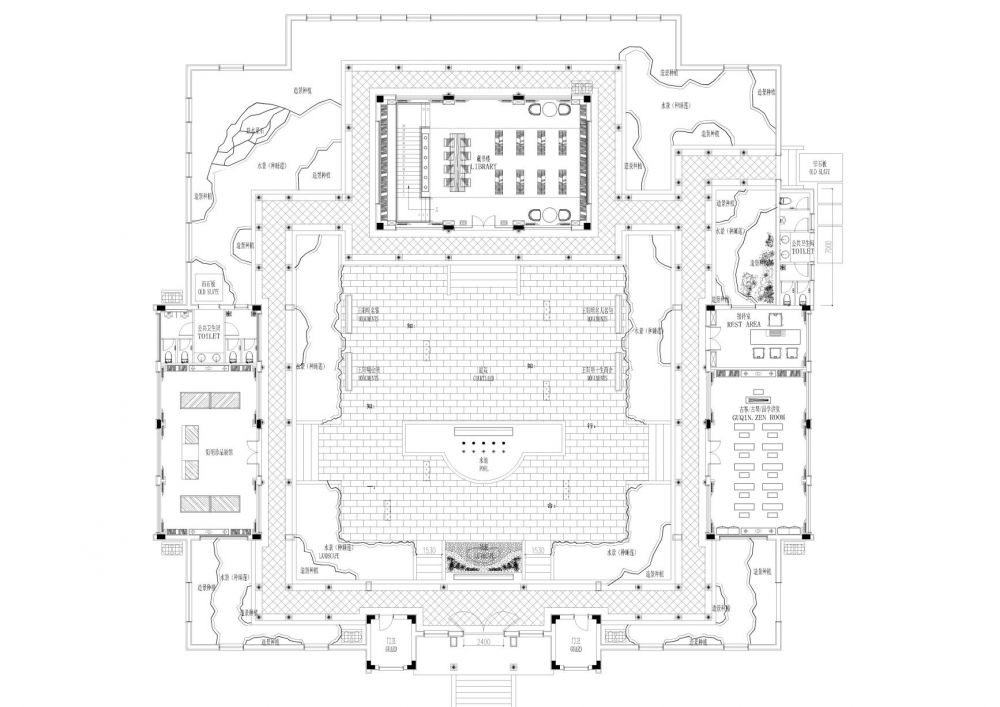 整個項目由典型的中式合院結(jié)構(gòu)圍合而成:由三幢主要的仿古建筑、加上接待室、值班室、圍廊等建筑物構(gòu)成,另設(shè)有牌樓、雕塑等外圍景觀小品,建筑物占地面積1480平米,建筑面積約750平米。接到案子后,設(shè)計小組經(jīng)過反復(fù)討論,對原建筑設(shè)計做了局部調(diào)整優(yōu)化:左廂房(陽明陳列館)的門窗做了局部調(diào)整,藏書樓的樓梯移位、門窗;琴房的公衛(wèi)位置等進(jìn)行了平面調(diào)整;室外景觀方面,由于考慮人流可能會較多,原中庭院的四個水景取消改為青石滿鋪,加地埋燈,增加泰山石造型及中間涌泉造型景觀;在入口增加玄關(guān)墻,把中式庭院景觀對于“隱與透”在書院的入口做一些“猶抱琵琶半遮面”的細(xì)部處理。