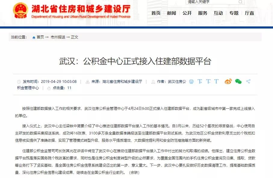 4月29日,湖北省住建廳官網(wǎng)發(fā)布了武漢住房公積金管理中心正式接入住建部數(shù)據(jù)平臺的新聞。武漢住房公積金管理中心于4月24日上午9:00正式接入住建部數(shù)據(jù)平臺。