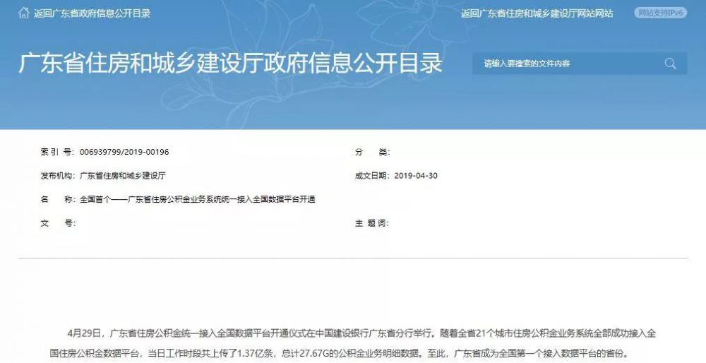 4月30日,廣東省住建廳官網(wǎng)發(fā)布了該省住房公積金業(yè)務(wù)系統(tǒng)統(tǒng)一接入全國數(shù)據(jù)平臺開通的新聞。廣東省成為全國第一個(gè)接入數(shù)據(jù)平臺的省份。