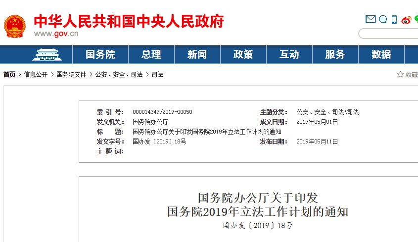 國務院2019年立法工作計劃