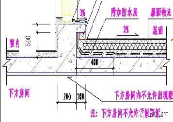 標(biāo)準(zhǔn)做法:屋面外墻根部及出屋面門口根部設(shè)置砼防水反坎,反坎高度至少高于屋面做法完成面10CM 以上。