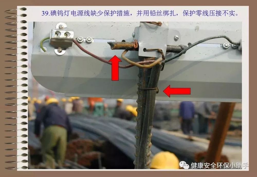 1、電源線直接和碘鎢燈管接在一起2、草坪燈使用鐵絲固定在角鋼上,無絕緣措施