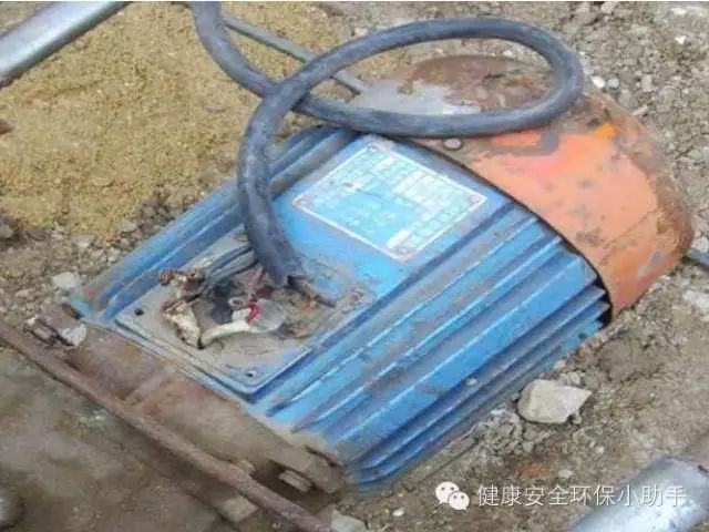 1、電機(jī)缺少防雨罩,無絕緣措施2、三條相線直接和電機(jī)線繞在一起,固定不牢