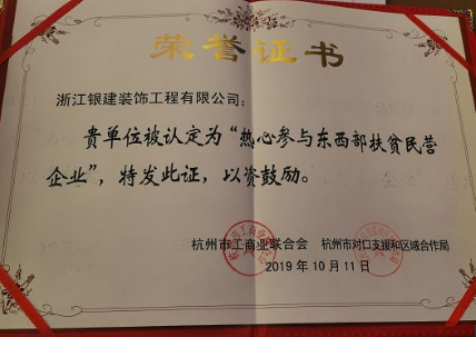 我司董事長(zhǎng)葉友希先生帶領(lǐng)浙江銀建裝飾工程有限公司也積極響應(yīng)打贏脫貧攻堅(jiān)戰(zhàn)的號(hào)召,捐款20萬(wàn)為扶貧攻堅(jiān)事業(yè)添磚加瓦。我司在自身健康發(fā)展的同時(shí),牢記習(xí)近平總書(shū)記扶貧開(kāi)發(fā)工作系列重要講話精神,始終不忘以實(shí)際行動(dòng)回饋社會(huì),踐行社會(huì)責(zé)任。