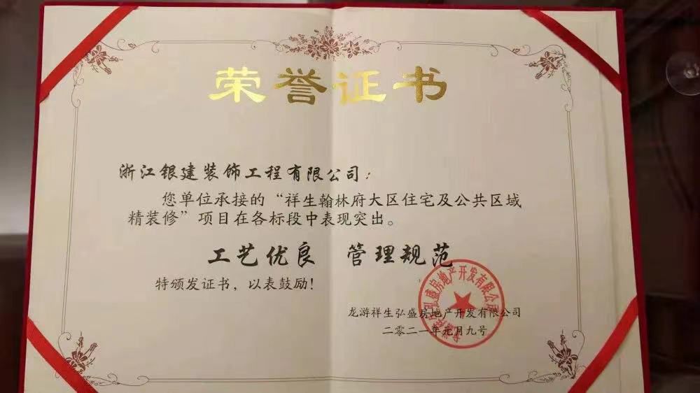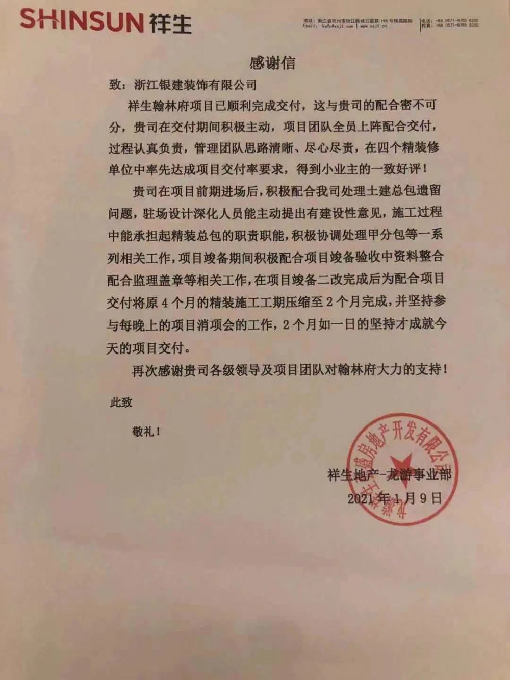 2021年1月19日,我司承接的“龍游祥生翰林府大區(qū)住宅及公共區(qū)域精裝修 ”項(xiàng)目收到由龍游祥生弘盛房地產(chǎn)有限公司送來(lái)的“施工優(yōu)良 管理規(guī)范”鮮艷錦旗、榮譽(yù)證書(shū)和感謝信。以感謝“龍游祥生翰林府大區(qū)住宅及公共區(qū)域精裝修”項(xiàng)目部工作人員在項(xiàng)目中優(yōu)質(zhì)施工、盡心盡責(zé)的服務(wù)!